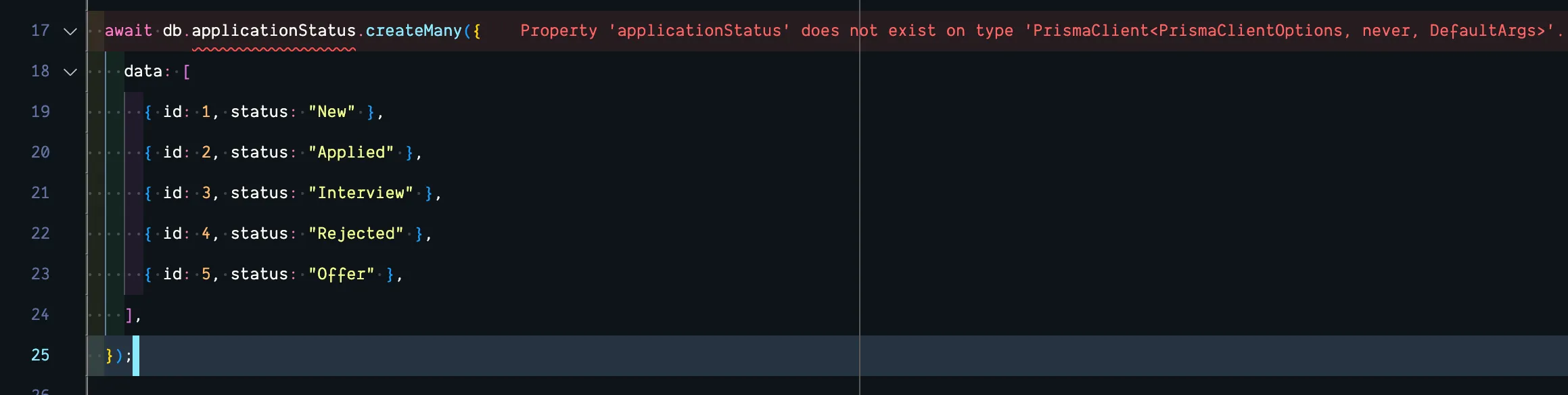 - On line 17-25, we’re adding all the job application statuses to the database. We’re using a standard Prisma