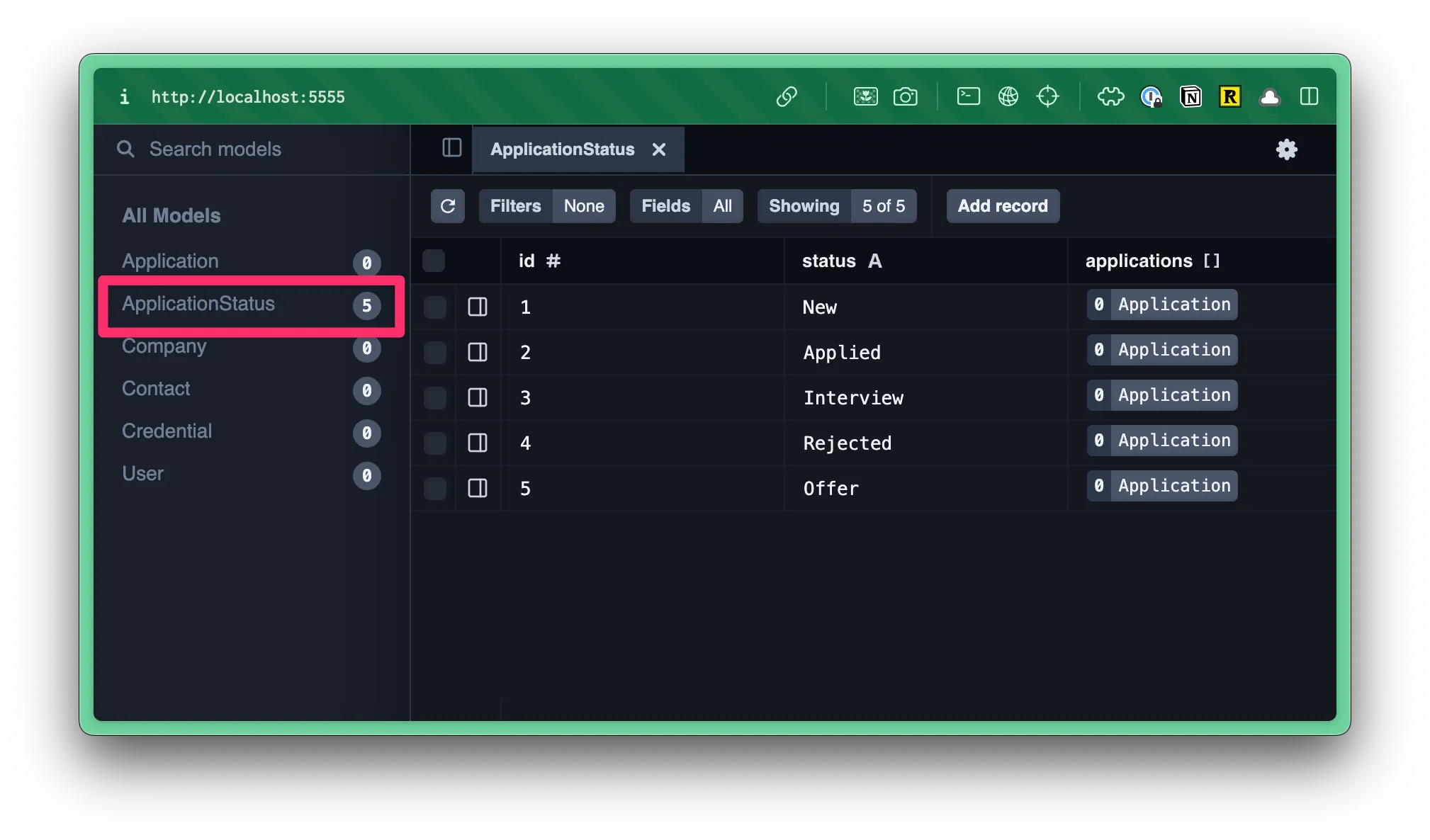 model ApplicationStatus { id Int @id @default(autoincrement()) status String}